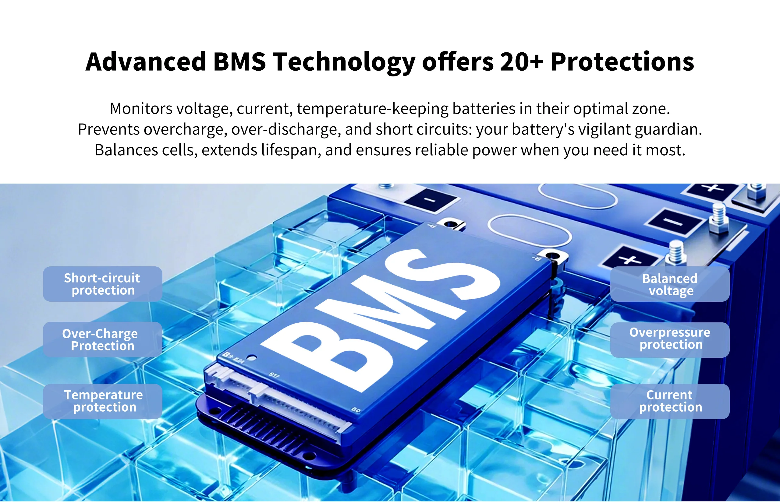 * Advanced BMS with current limiting & multi-protection (overcharge/discharge/temp).